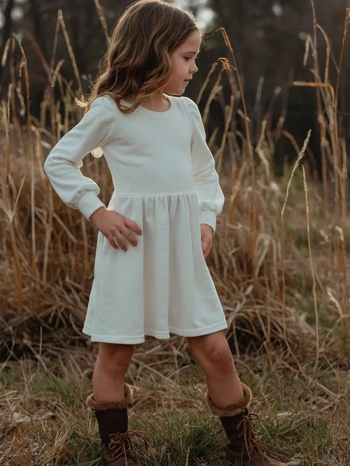 A winter dress made for twirling, toddling, and staying warm in the chilly months. This cozy long-sleeve bishop dress is crafted from buttery soft bamboo cotton French terry — the same premium knit fabric used in our beloved sweatshirts — offering both warmth and breathability for everyday play or special seasonal moments.