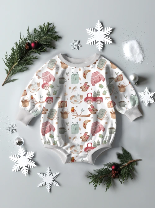 Each romper features fun and festive winter-themed prints — from snowflakes and slippers to cozy sweaters and mugs of cocoa — making it a perfect pick for the holidays and chilly days ahead.