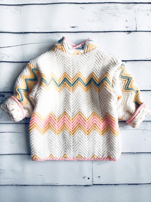 A one of a kind upcycled jacket made from reclaimed hand knit and hand crocheted textiles in soft cream with warm pastel zigzags. Designed with an oversized fit so it can be worn and loved for years, not just a single season.