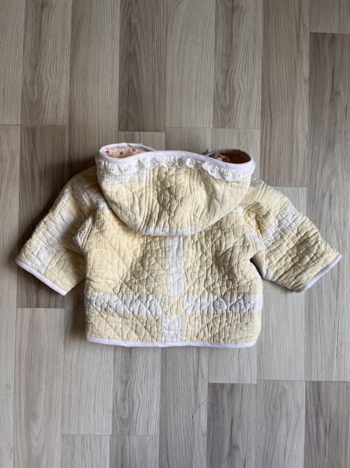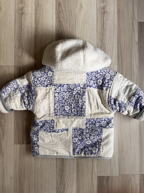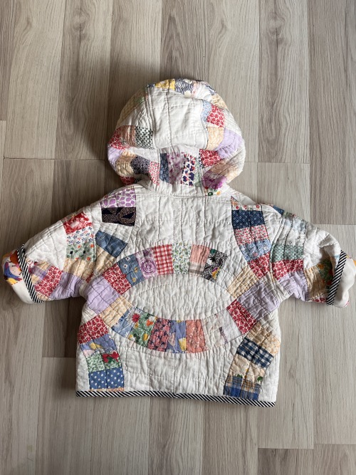 A swirl of lavender and peach tones stitched into playful patchwork, this jacket feels like a scoop of summer sherbet on a chilly day. Made from a revived vintage quilt, it’s lightweight yet cozy, with oversized pockets, a longer length, and a soft hood for all-day comfort. Each stitch tells a story, making this one-of-a-kind piece as sweet as your little dreamer.