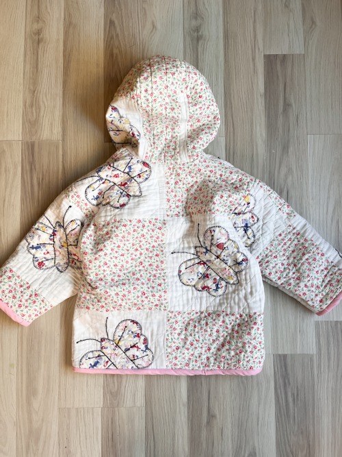 The Butterfly Garden Jacket is made from upcycled vintage quilts featuring hand-stitched butterfly appliqué details and a ditsy floral print that feels straight out of a storybook. Lined with soft fleece for extra warmth and finished with pink trim, it’s as sweet as it is cozy. With its oversized fit and one-of-a-kind charm, this jacket was made for twirls, adventures, and collecting little treasures along the way.
