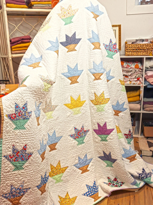 This quilt features a classic Dresden Plate pattern, with each “flower” made from individually pieced petals in soft, delicate florals. The pastel tones and tiny prints give it a light, airy feel, almost like a scattered field of vintage blossoms.